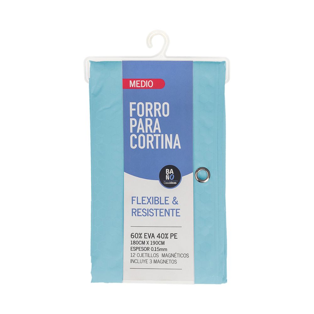 Forro para cortina de baño Plástico con textura, flexible, resistente y con 12 ojillos metálicos. Espesor 0,15 mm. Incluye 3 magnetos. Tipo de fijación: ojillos PVCLavar a mano. No blanquear. No usar secadora. No planchar. No lavar en seco.