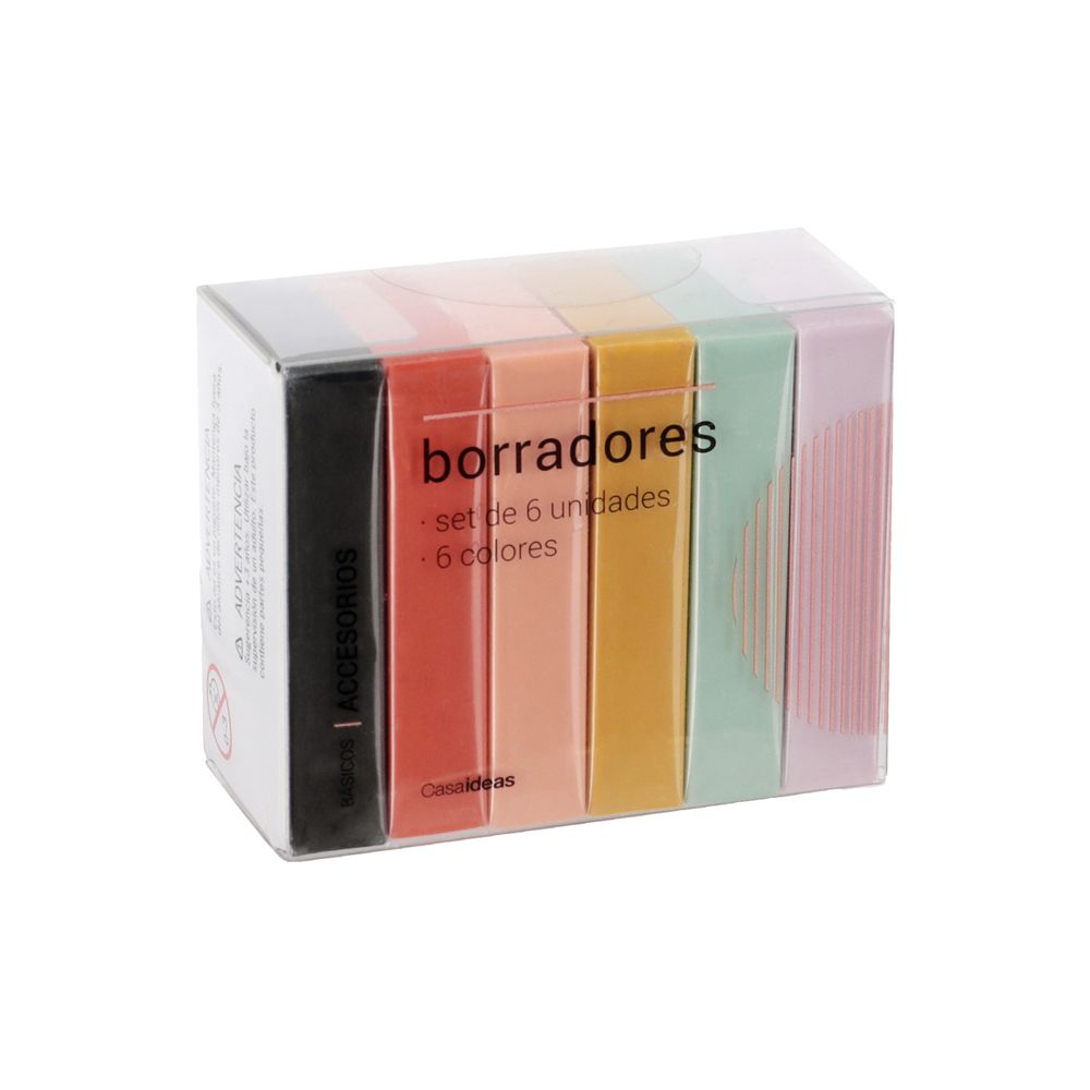 Set 6 gomas de borrar de diferentes colores. Tienen un tamaño de 4.4x2.4x1.4 cm.