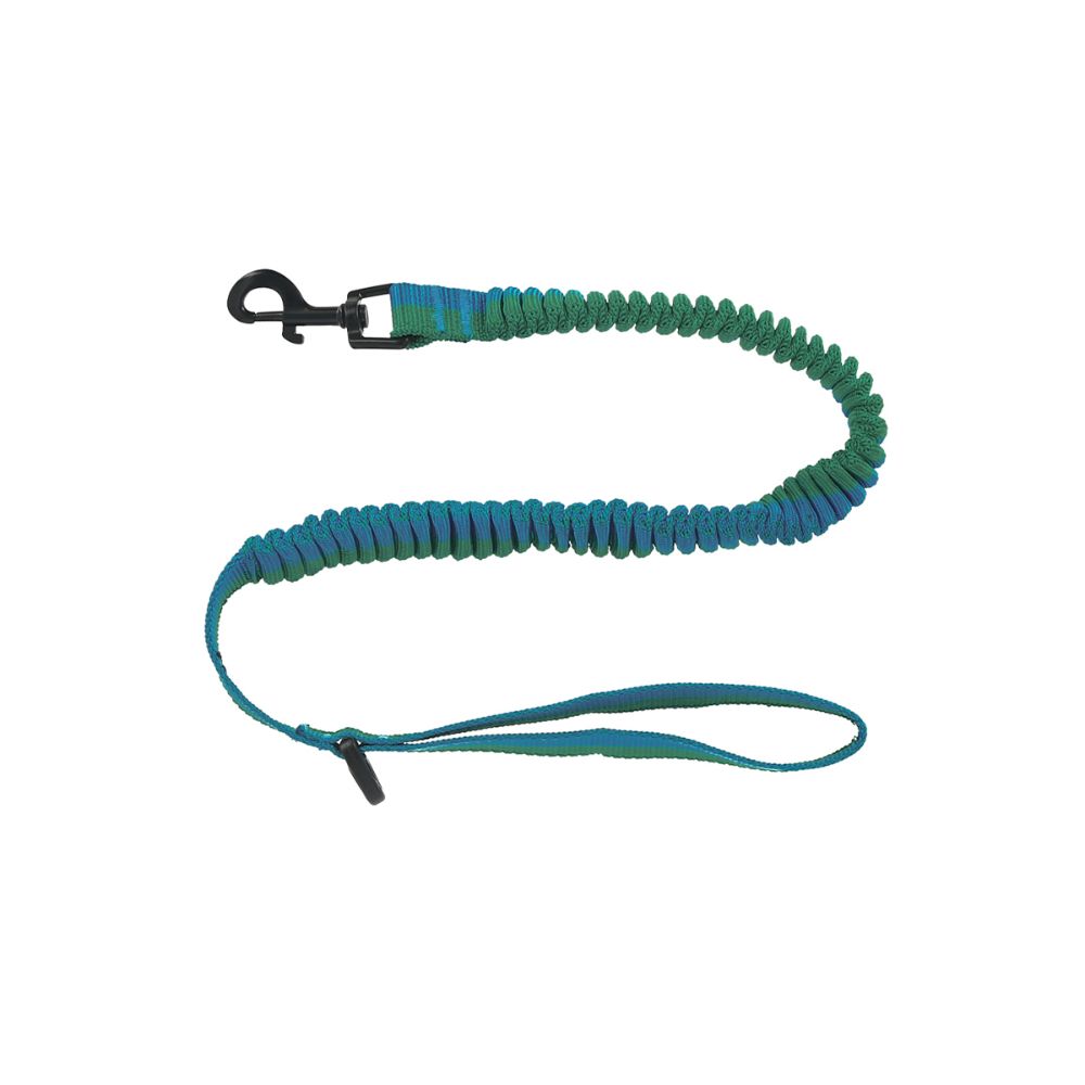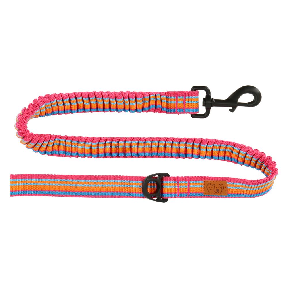 Correa retráctil antishock de cinta tejida poliéster bicolor con gancho metálico. Ventajas: La correa absorbe el golpe y los protege de lesiones. Se usa en entrenamiento o para paseos diarios. Disponible en dos tallas. Lavar a mano con detergente suave