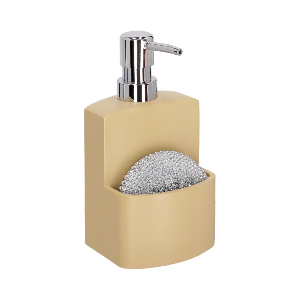 Dispensador de jabón para trastes para la cocina con porta esponja y esponja incluida. Tiene una capacidad de 250 ml.