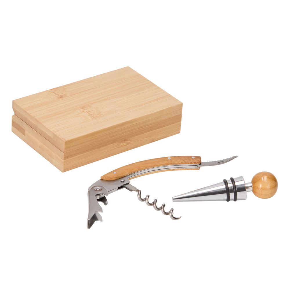Caja de madera con set de accesorios para vino. Incluye un descorchador y un tapa botella.