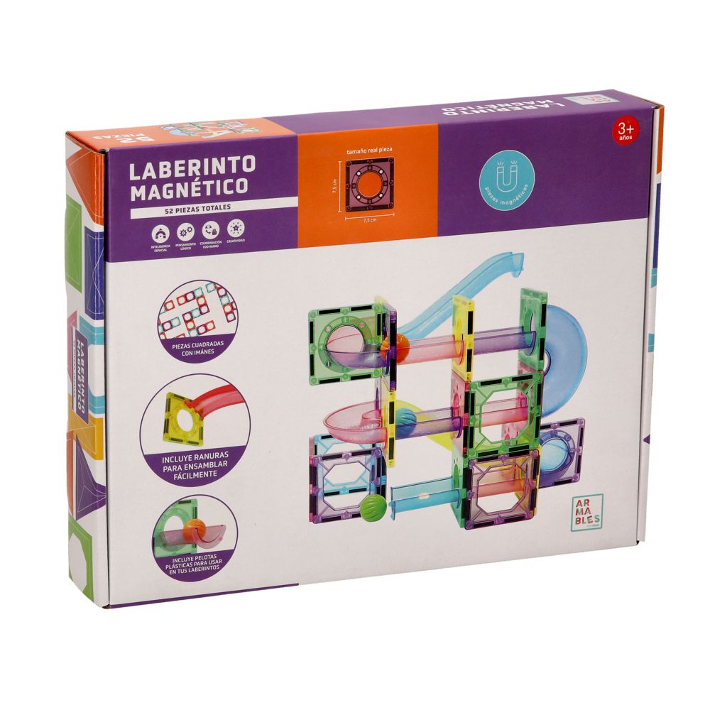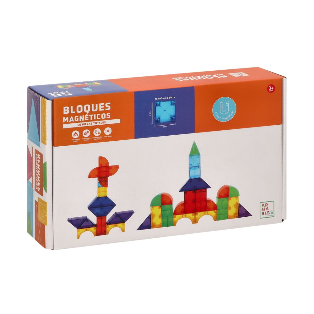 Bloques magnéticos armables. Este producto es ideal para que los niños desarrollen habilidades como inteligencia espacial, pensamiento lógico, coordinación ojo-mano y creatividad. Ideal para mayores de 3 años. Tiene un total de 56 piezas.