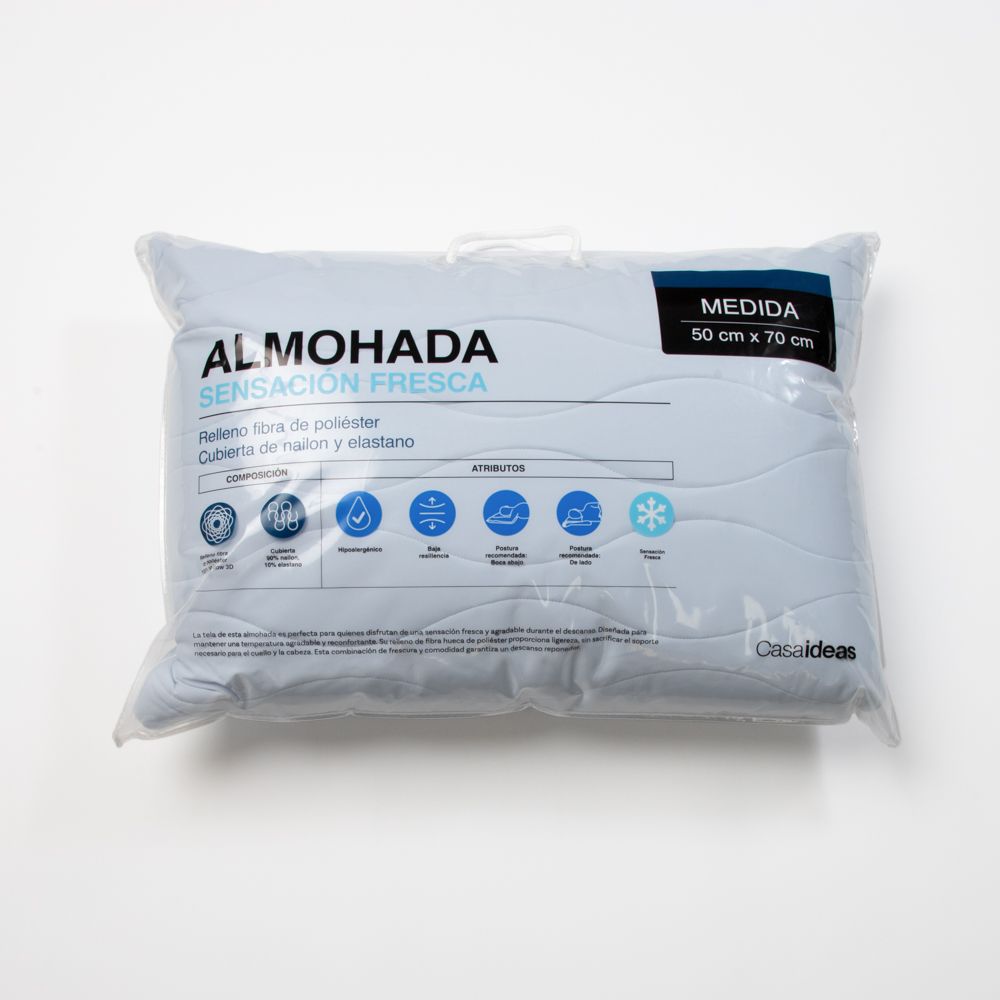 Almohada con tecnología “Sensación Fresca”. La tela innovadora de esta almohada es ideal para personas que aman la sensación fresca en sus camas. Su composición de polietileno y poliéster entregan frescura y suavidad. Cuenta con una capa posterior de poliuretano que evita la absorción de líquidos, logrando repelerlos de la superficie. De esta forma, facilita su limpieza y, al ser repelente, asegura una mayor vida útil del colchón. Tiene un tamaño de 50x70 cm.