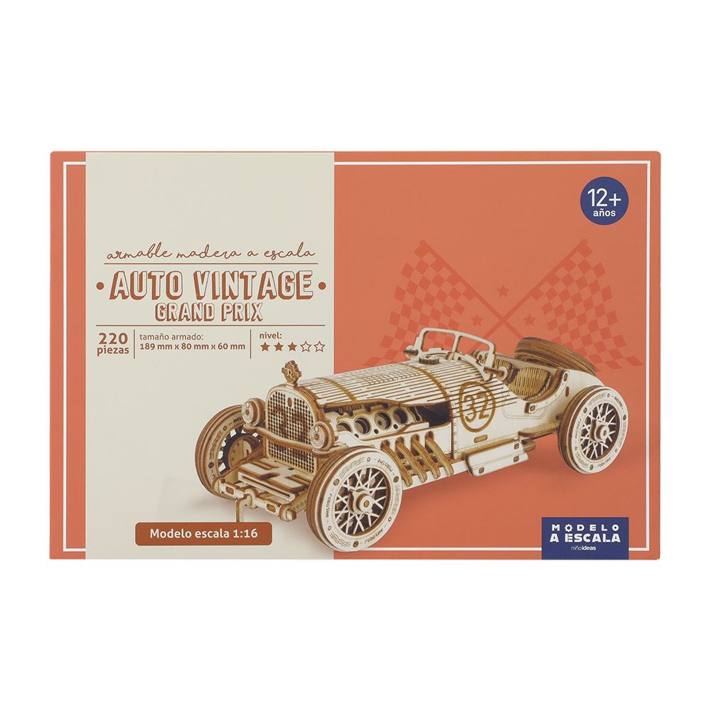 Armable de madera de auto vintage grand prix. Contiene 220 piezas. Tiene una medida de 18.9x8x6 cm al ser armado. Requiere armado (incluye instrucciones). Ideal para mayores de 12 años.