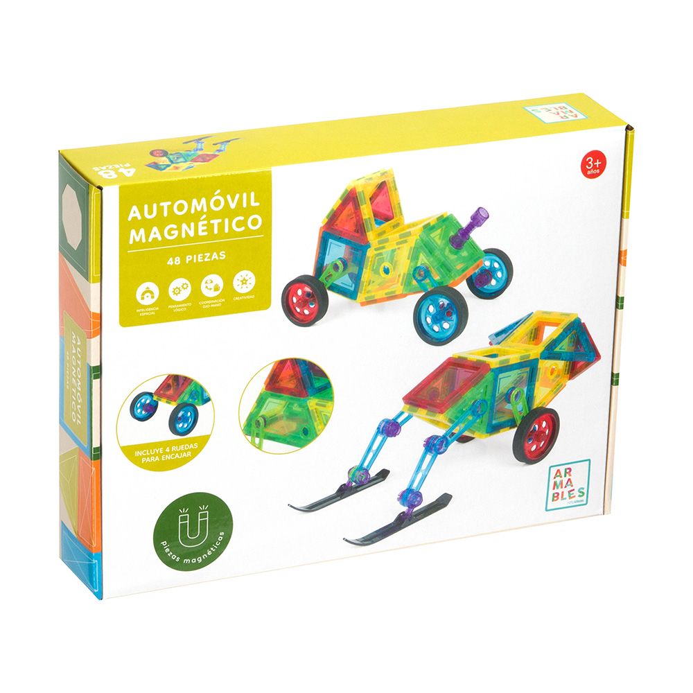 Armable de automóvil magnético con 48 piezas. Incluye 4 ruedas para encajar. Este juguete ayuda a desarrollar la inteligencia espacial, el pensamiento lógico, la coordinación ojo mano y la creatividad. Ideal para mayores de 3 años.