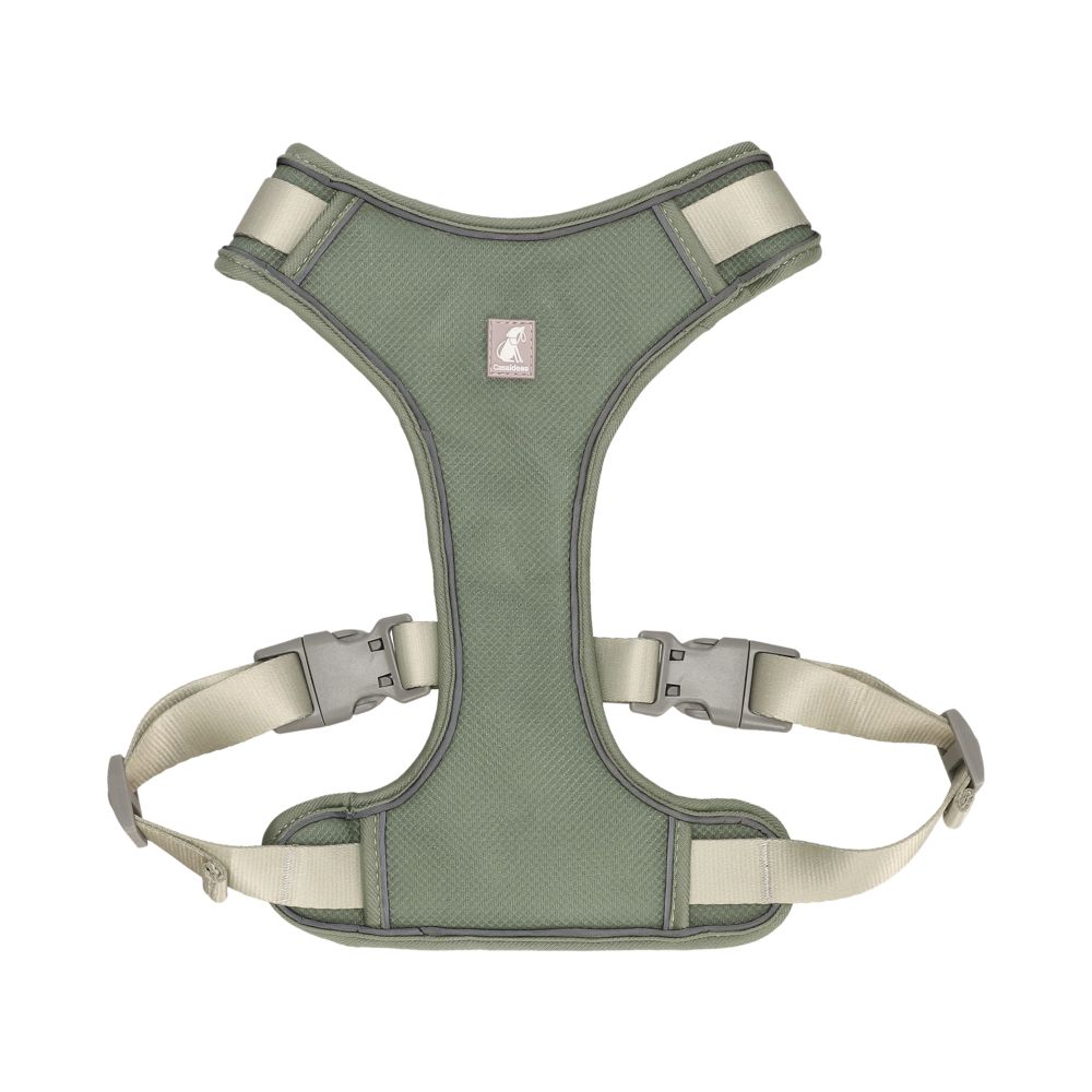Arnés tipo pechera acolchado con cuatro puntos de ajuste (cuello y pecho) con cinta reflectante, argolla de metal en D para fijar la correa, dos hebillas de plástico para mayor seguridad. El reverso del arnés está cubierto con una malla suave que permite que el aire fluya, así tu mascota estará más cómoda y fresca.