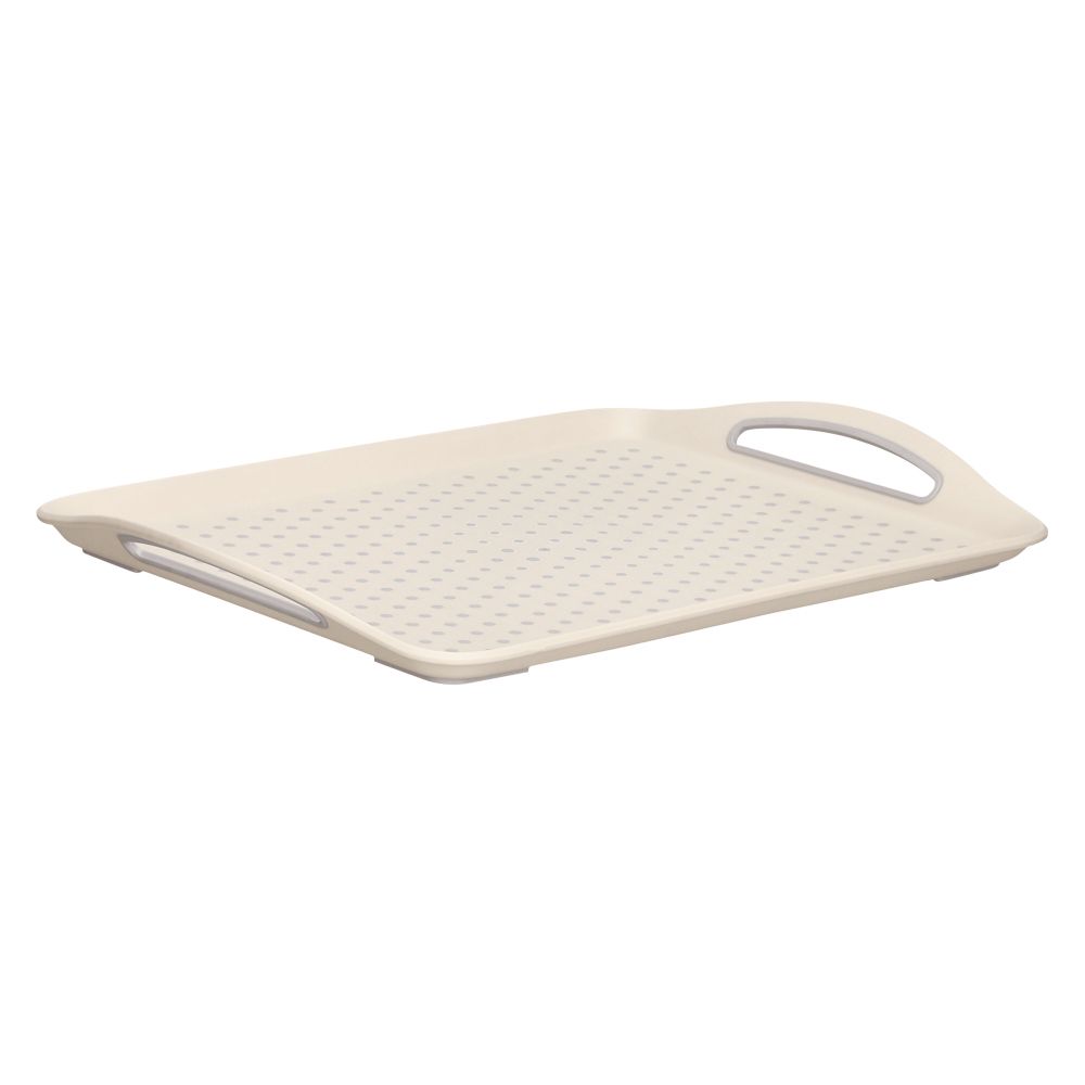 Bandeja rectangular de melamina con antideslizante en la superficie y asas para sujetar.