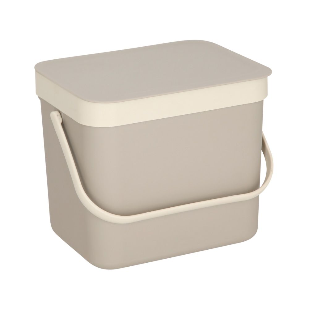 Basurero para desechos orgánicos de plástico con sistema de succión para bolsas, manillas de traslado y opción de mantener la tapa abierta.