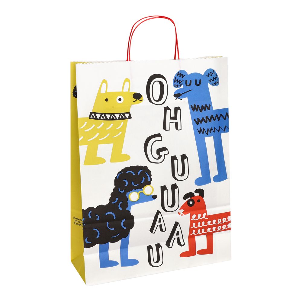 Bolsa de papel kraft blanco 100 gr, con diseño impreso y asas de papel retorcido. Tiene un tamaño de 30x10x41 cm