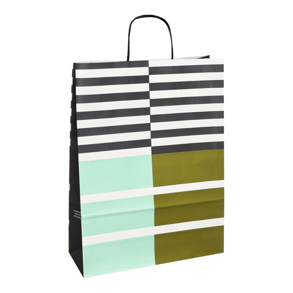 Bolsa de papel kraft blanco 100 gr, con diseño impreso y asas de papel retorcido. Tiene un tamaño de 30x10x41 cm