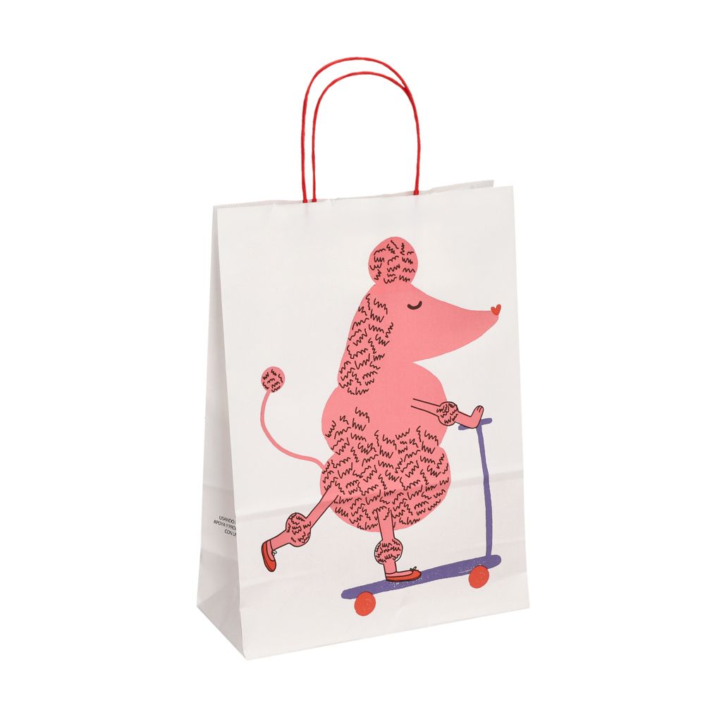 Bolsa de papel kraft blanco 100 gr, con diseño impreso y asas de papel retorcido. Tiene un tamaño de 22x10x30 cm