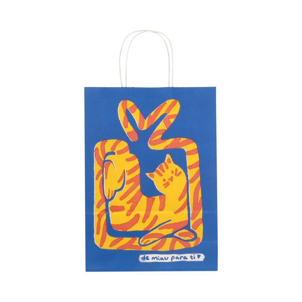 Bolsa de papel kraft blanco 100 gr, con diseño impreso y asas de papel retorcido. Tiene un tamaño de 22x10x30 cm