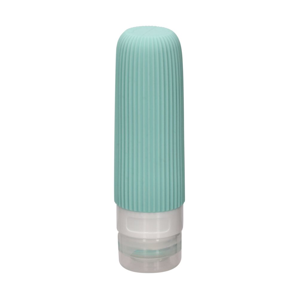 Botella de silicona para llevar tus líquidos. Ideal para viajar. Tiene una capacidad de 90 ml y un tamaño de 3.8x12.8 cm.