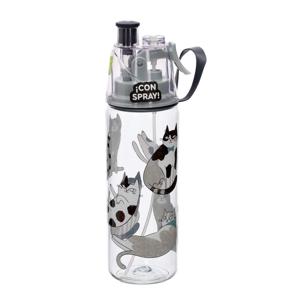 Botella agua de tritan con tapa y atomizador. El tritan es un plástico con alta transparencia, resistente a impactos, reciclable y ligero.