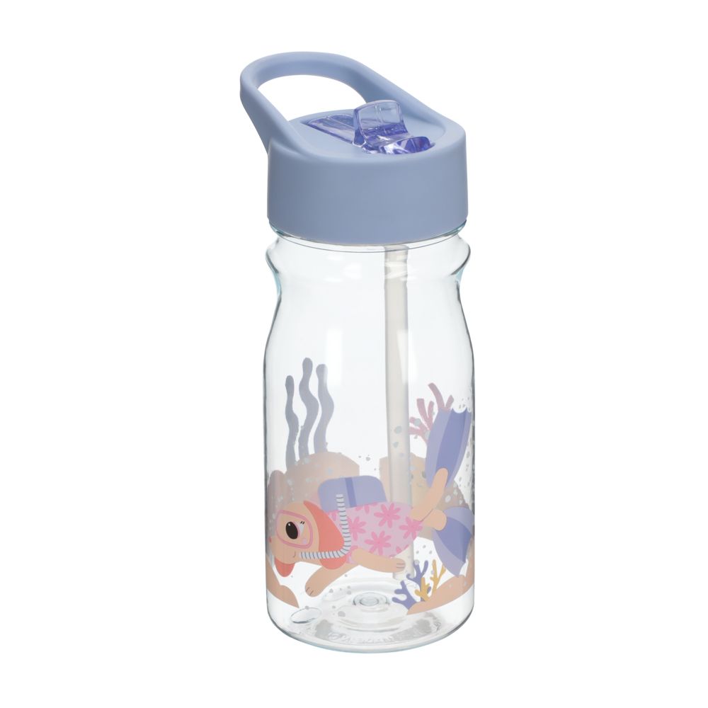 Botella de tritan con tapa y bombilla de PP y diseño estampado.El tritan es un plástico con alta transparencia, resistente a impactos, reciclable y ligero.