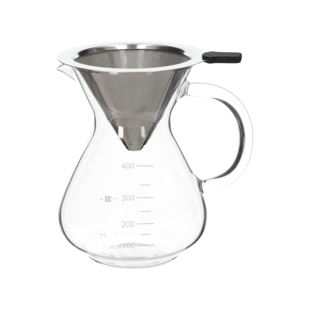 Cafetera por goteo de vidrio borosilicato con filtro de acero inoxidable. ¡Ocúpala con tu Tetera para café por goteo! Cuenta con una capacidad de 400 ml. Tiene un tamaño de 14x9.5 cm.