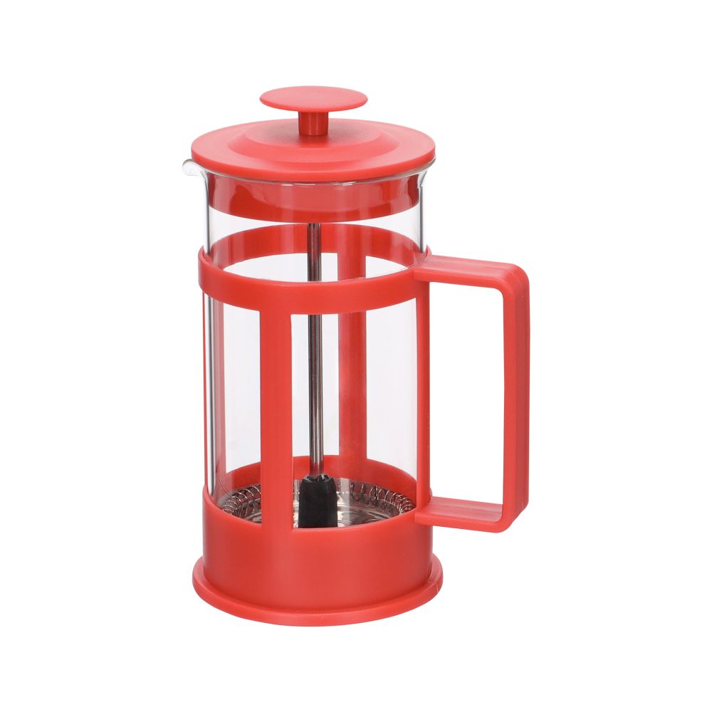 Cafetera francesa de vidrio con soporte de polipropileno resistente a altas temperaturas y filtro de acero inoxidable (contiene instrucciones de uso). Incluye una cuchara para medir de polipropileno. Cuenta con una capacidad de 350 ml.