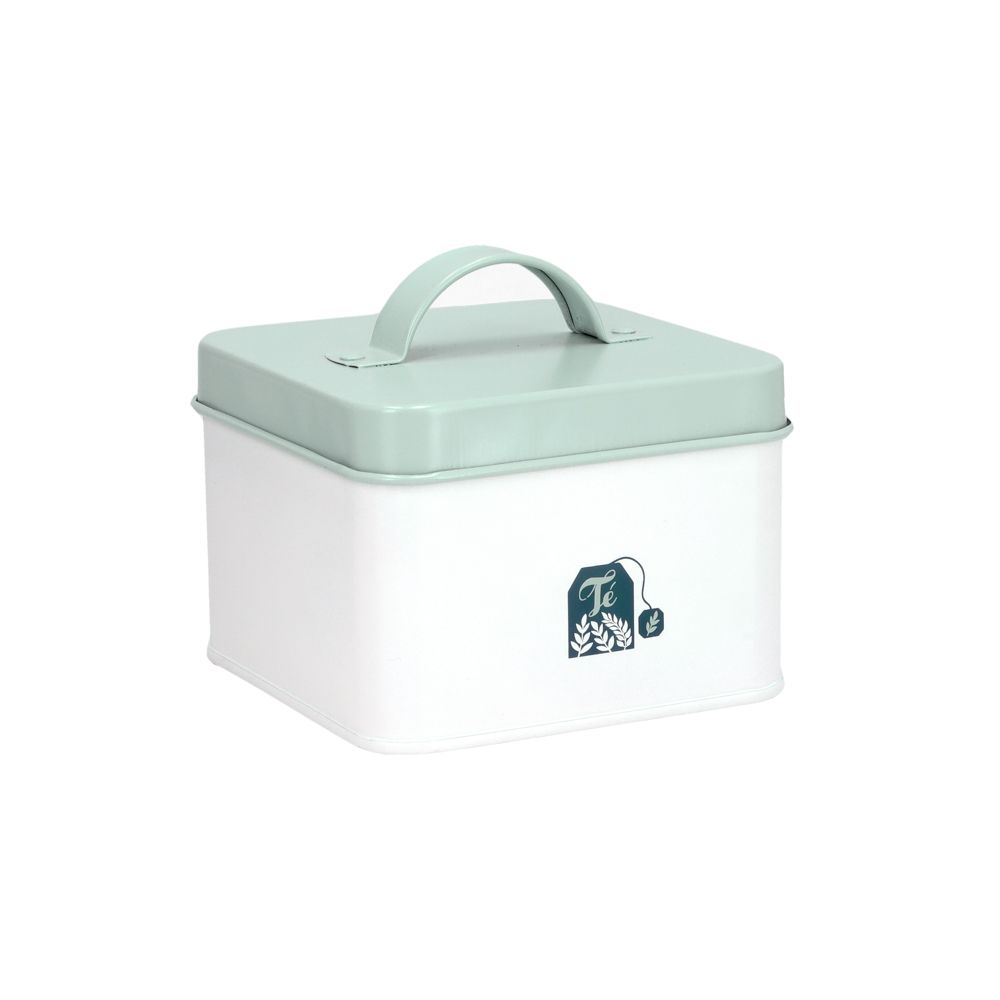 Caja de metal esmaltado para almacenar bolsas de té. Cuenta con un tamaño de 12x12x11.2 cm.