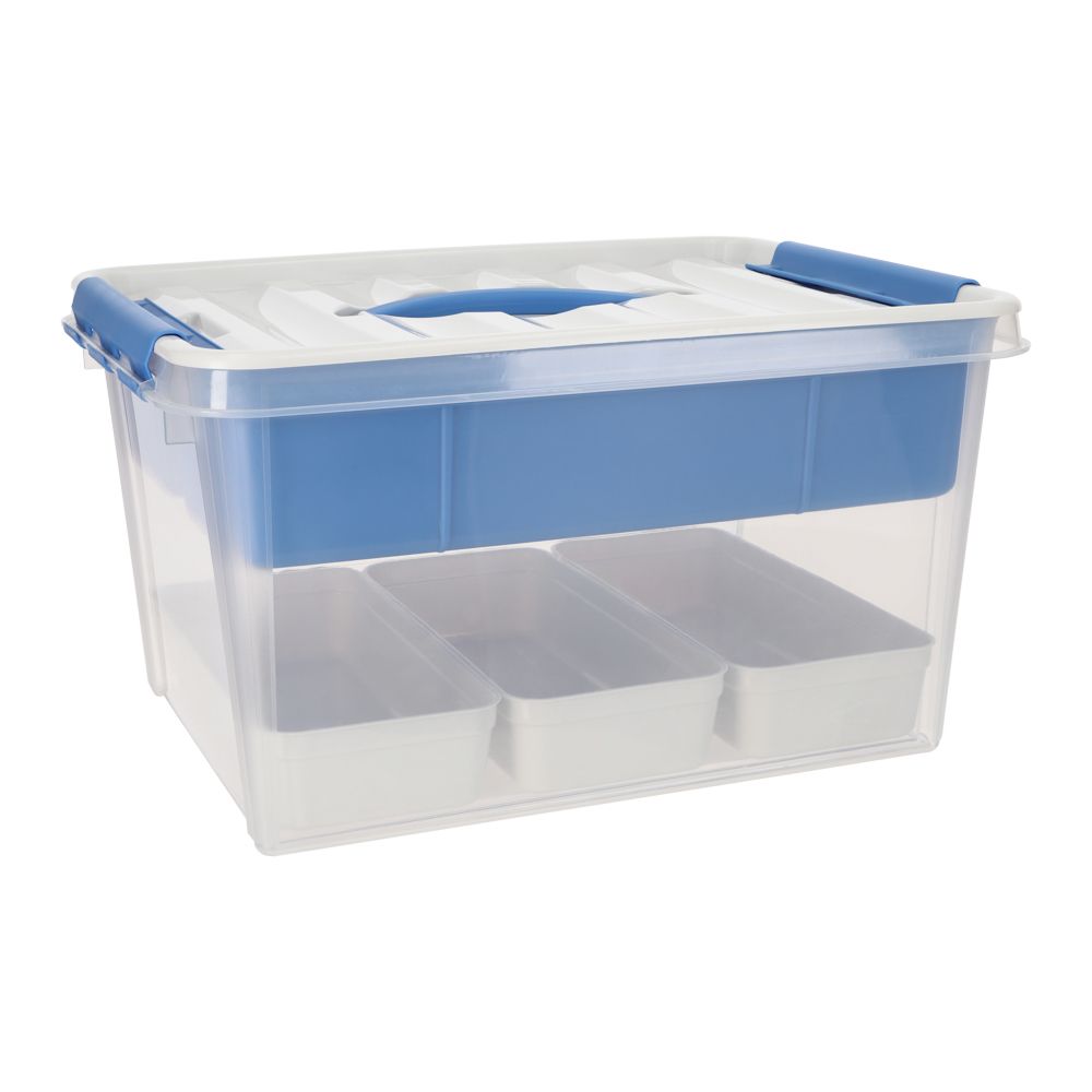 Caja multifuncional de plástico polipropileno con un compartimiento y 4 bandejas. Tiene una capacidad de 18 litros. Tiene un tamaño de 39.5x29.5x21.5 cm.