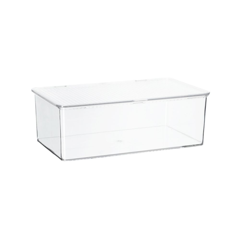 Caja organizadora de plástico PET transparente con tapa abatible. Ideal para despensa o refrigerador. Tiene un tamaño de 27.5x15.8x9.5 cm y una capacidad de 4 l.
