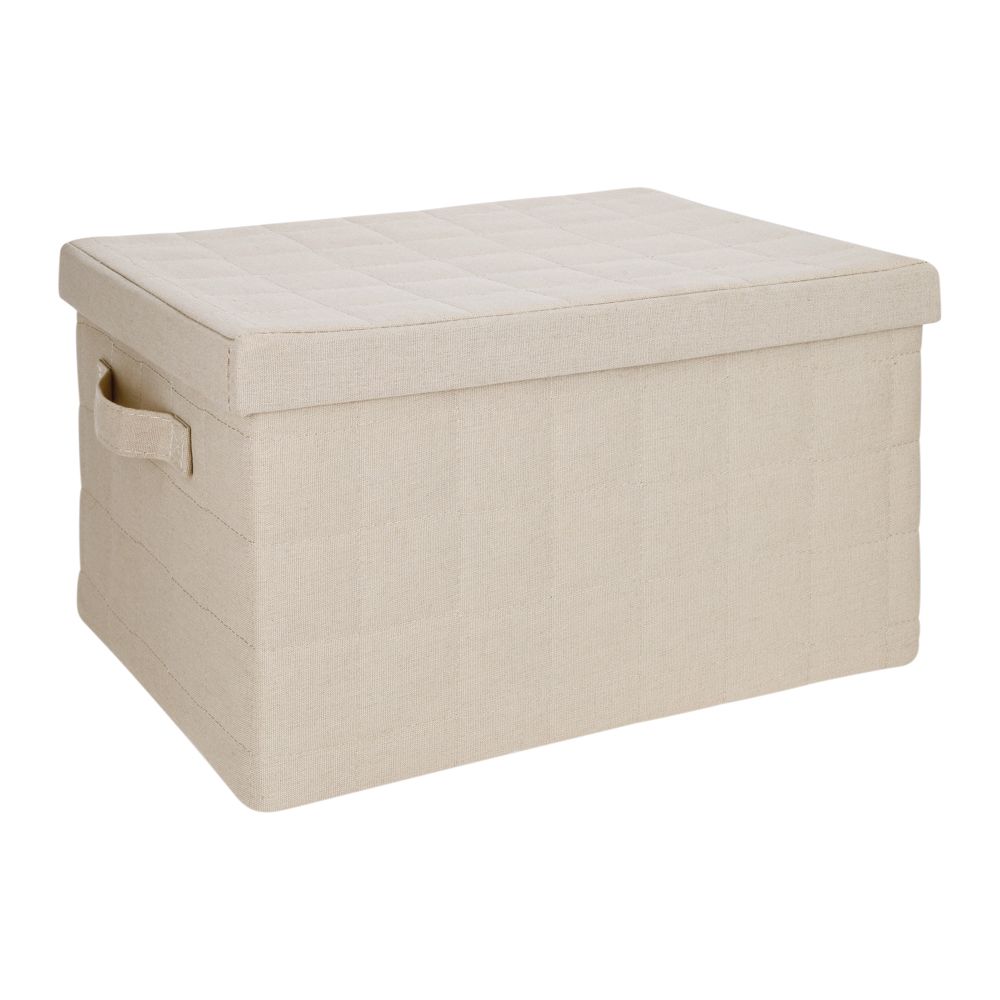 Caja organizadora de tela con tapa y con diseño quilt. Tiene un tamaño de 38x28x22 cm.