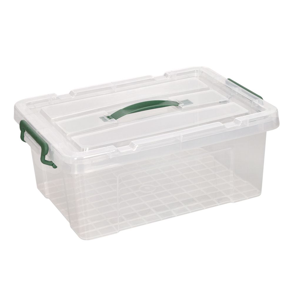 Caja de plástico polipropileno con tapa. Tiene una capacidad de 12.5 litros. Tiene un tamaño de 42.5x30x12.5 cm.
