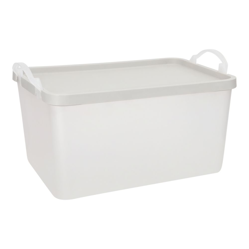 Caja plástica organizadora con tapa y asas. Tiene una capacidad de 12 litros. Tiene un tamaño de 36x24x20 cm.