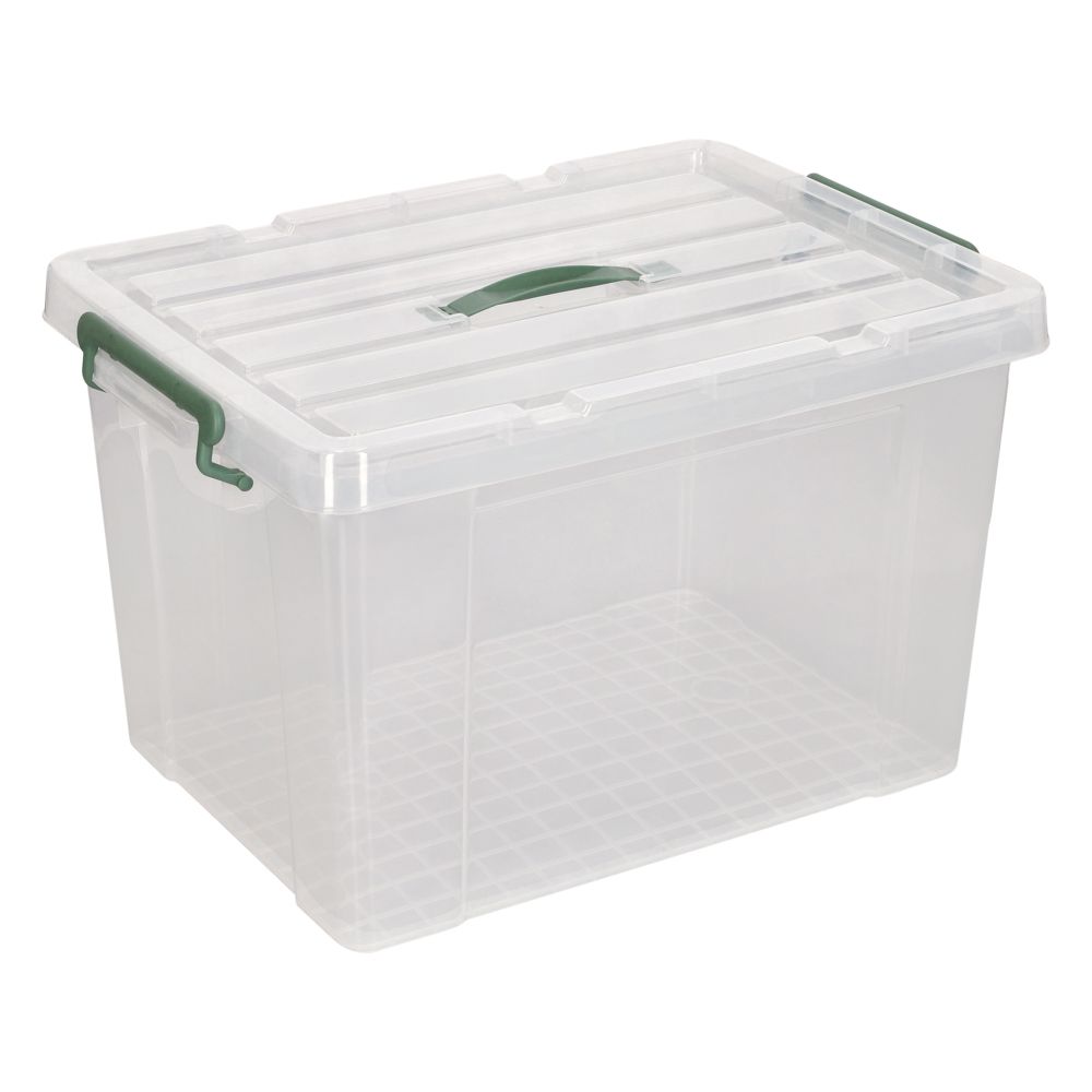 Caja de plástico polipropileno con tapa. Tiene una capacidad de 50 litros. Tiene un tamaño de 50x39x32 cm.