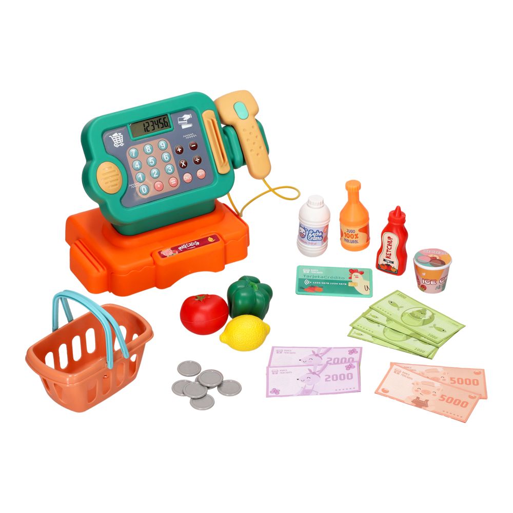 Caja registradora de juguete con escáner de productos y calculadora integrada. Contiene 32 piezas con abarrotes, verduras, billetes, monedas y más.