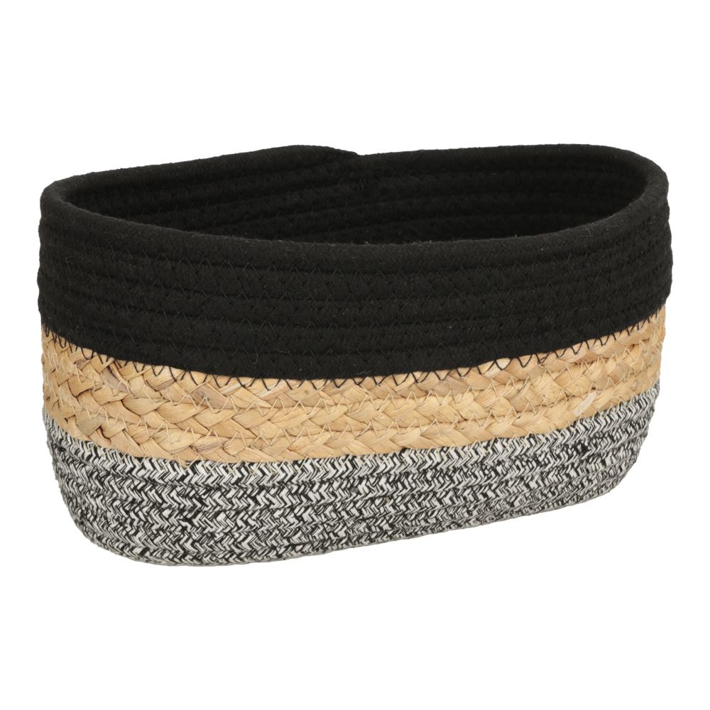 Canasto organizador de tela de algodón y fibra natural. Tiene un tamaño de 26x13x10 cm.