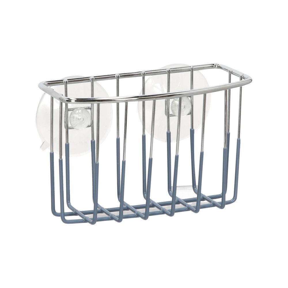 Canasto organizador para el lavaplatos de alambre de acero recubierto con goma y con una ventosa de succión para adherir al lavaplatos.