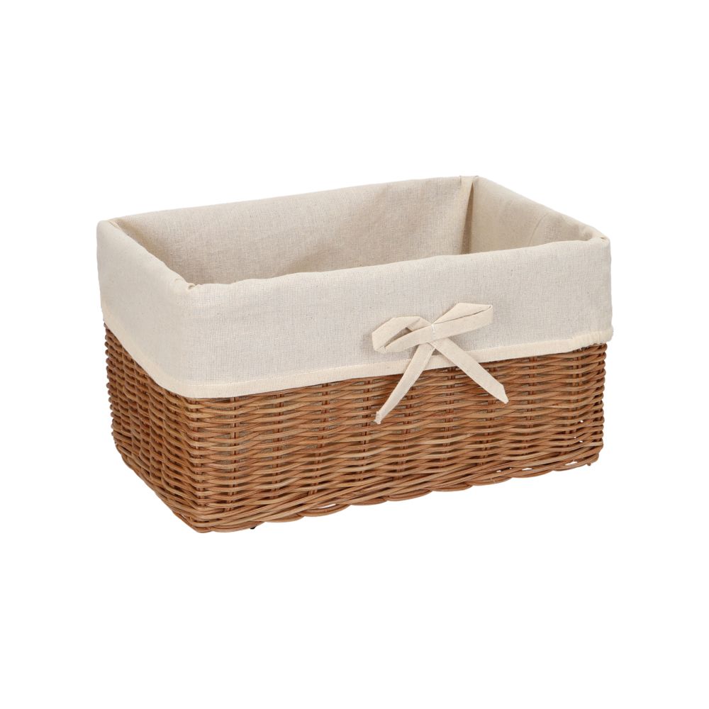 Canasto organizador de ratan con interior de tela. Tiene un tamaño de 28x20x15 cm.