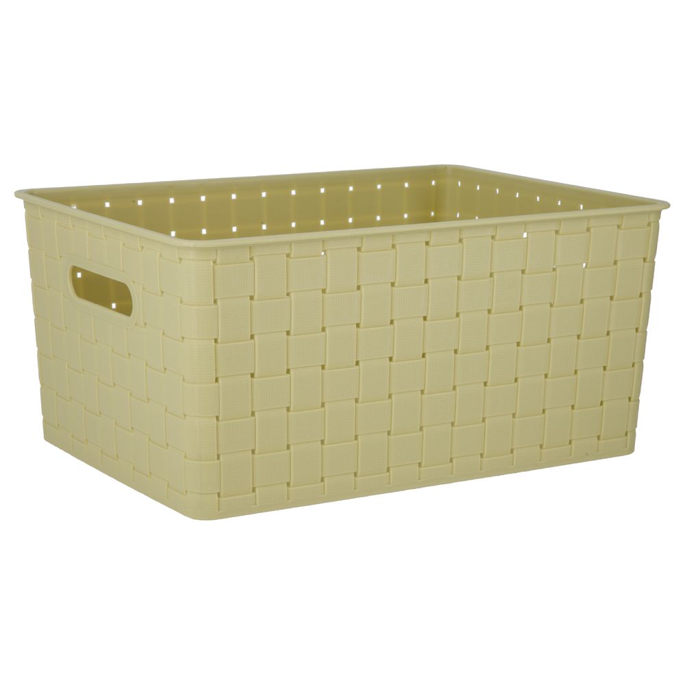 Canasta plástico con textura trenzada. Tiene una capacidad de 8.5 lt. Limpiar con paño húmedo. Tiene un tamaño de 31x22.5x14.5 cm.