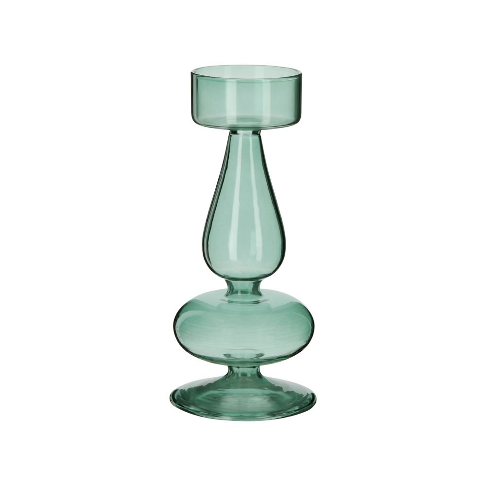 Candelabro de vidrio de color boro para vela tealight. Tiene un tamaño de 9x6.5x14.5 cm.