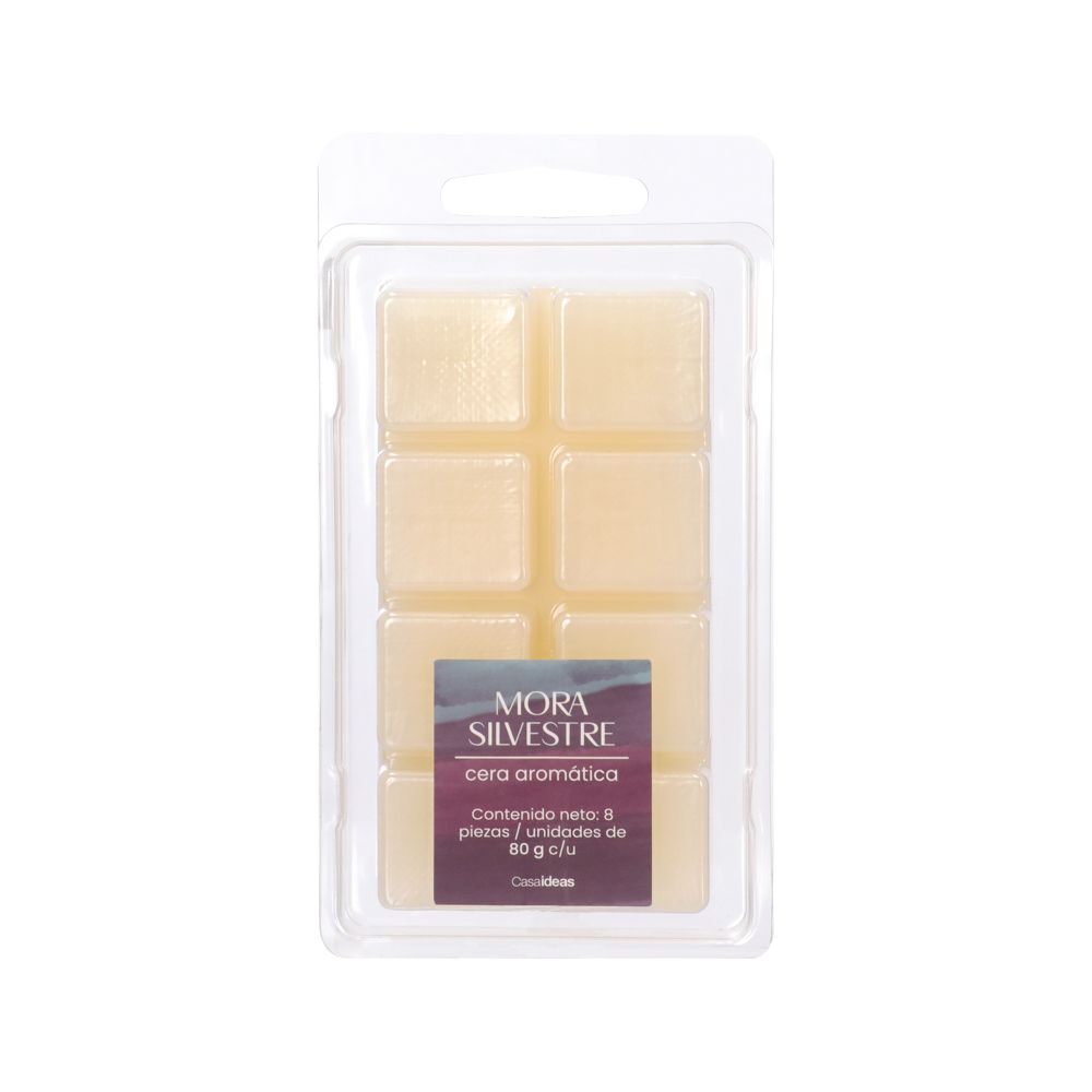 Cera aromática en barra con olor de Mora Silvestre. En este producto vienen 8 cubitos de 80 gr cada uno para derretir en quemadores de aceite y aromatizar tu hogar.