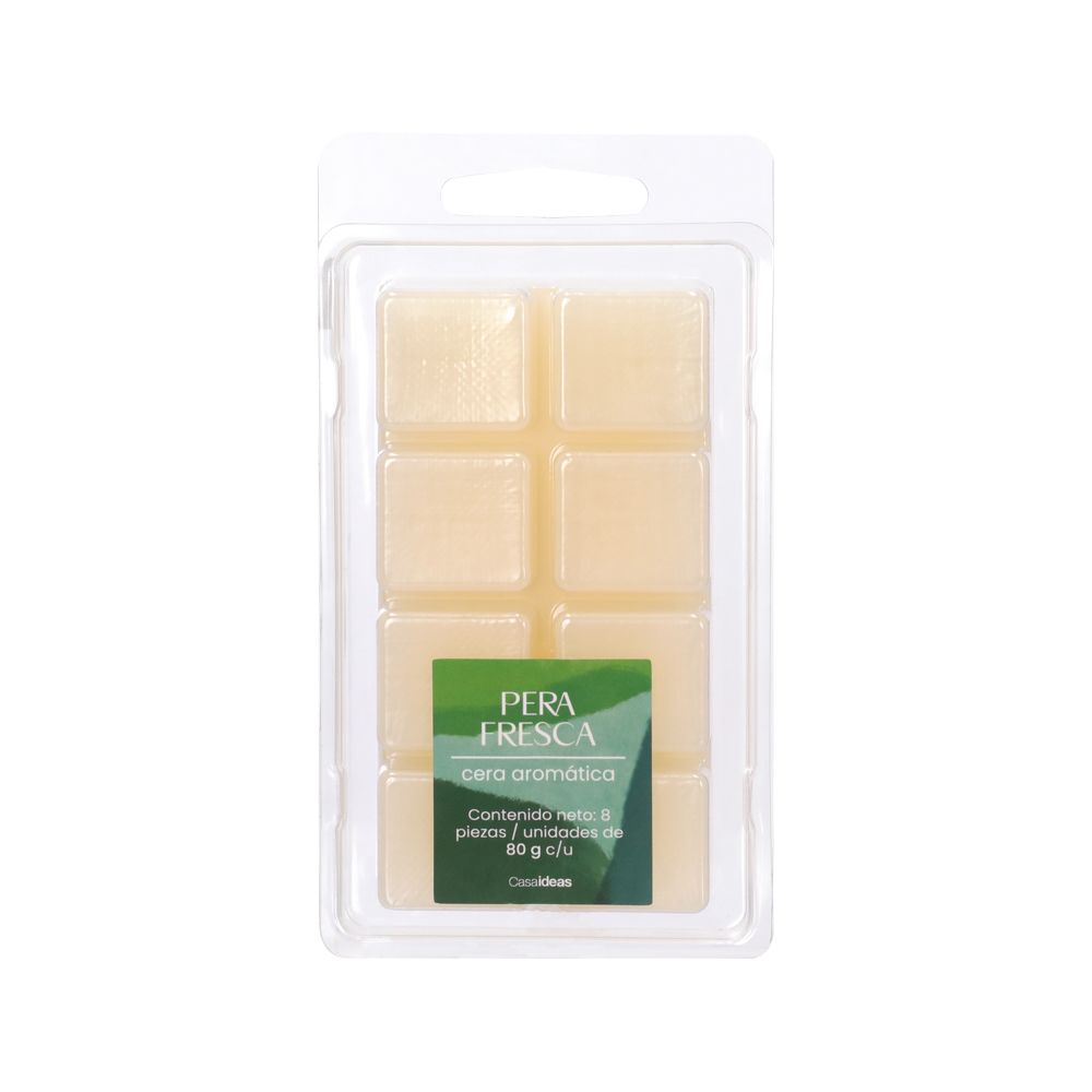 Cera aromática en barra con olor de Pera Fresca. En este producto vienen 8 cubitos de 80 gr cada uno para derretir en quemadores de aceite y aromatizar tu hogar.