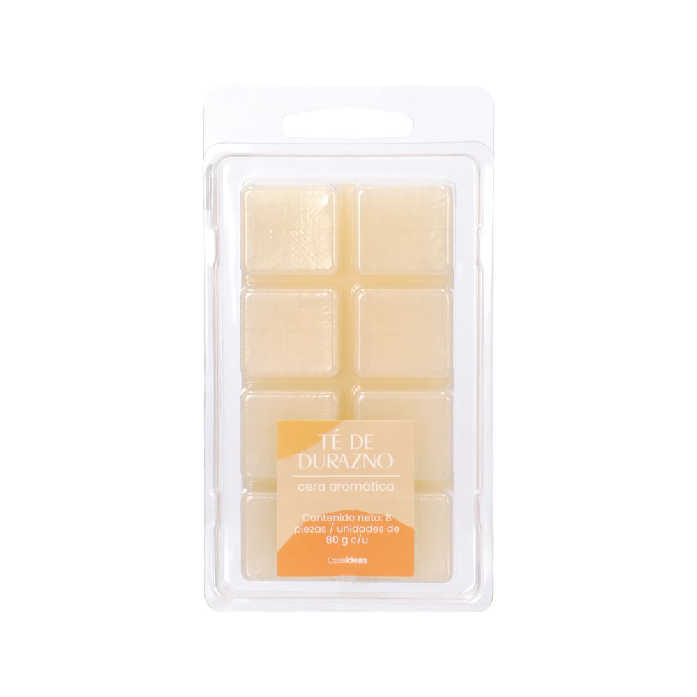 Cera aromática en barra con olor de Té de Durazno. En este producto vienen 8 cubitos de 80 gr cada uno para derretir en quemadores de aceite y aromatizar tu hogar.