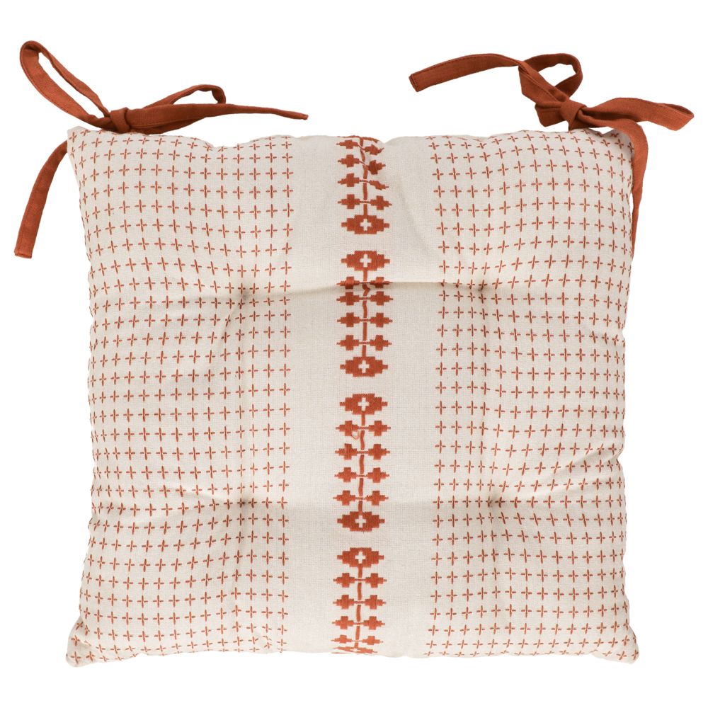 Cojín con cubierta de algodón tejido, amarras para fijar a la silla y relleno de poliéster. Tiene un tamaño de 40x7x40 cm.