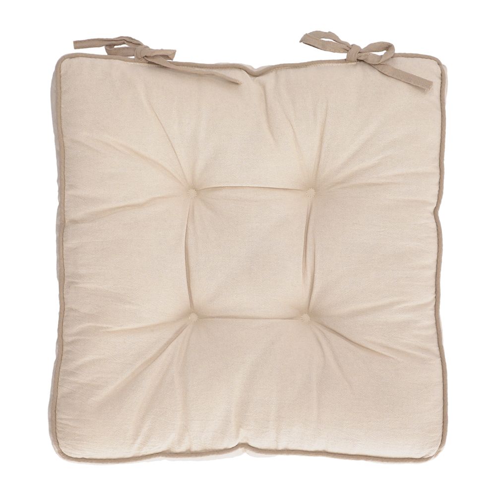 Cojín con cubierta de algodón, amarras para fijar a la silla y relleno de poliéster. Tiene un tamaño de 40x40 cm.