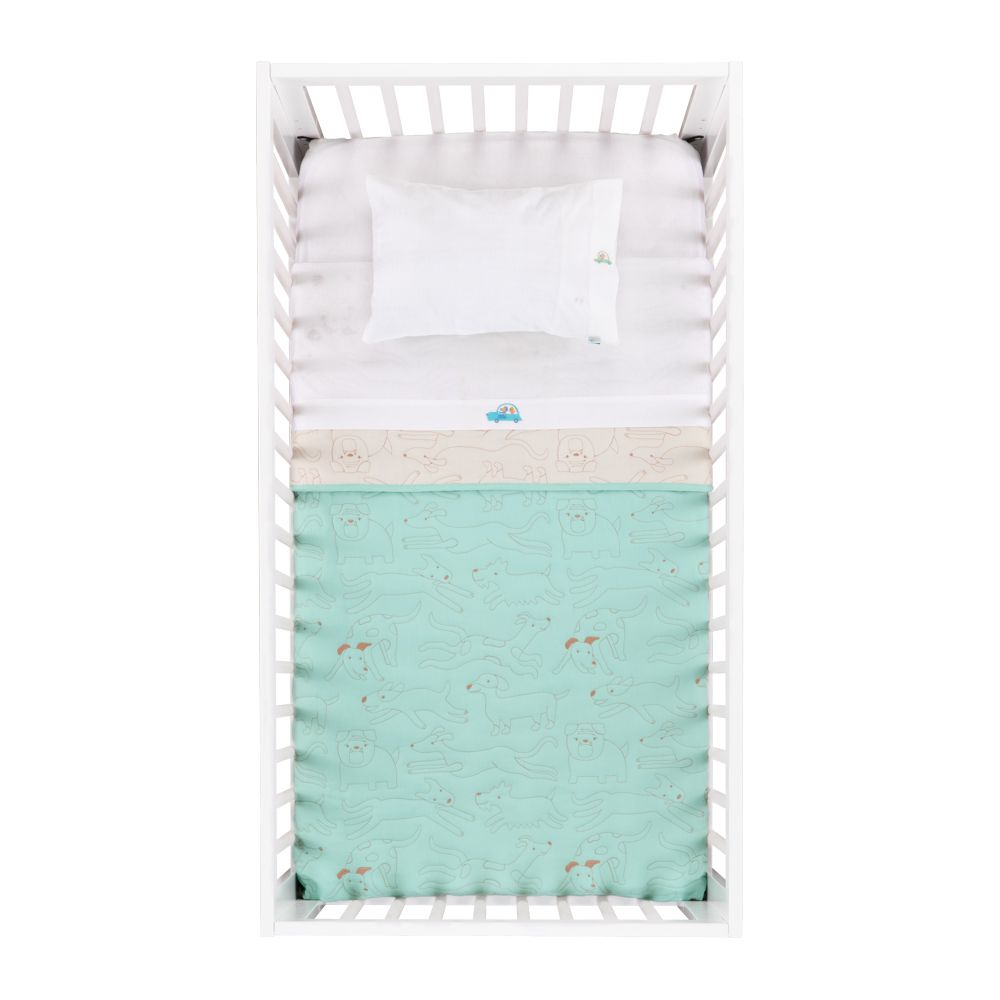 Colcha de cuna con lindo diseño de perritos. Tiene un tamaño de 100x160 cm. Lavar a máquina proceso delicado con agua a 40 °C No blanquear, No usar secadora, Planchar a 110 °C,Lavado en seco profesional proceso normal, Lavar antes de usar, cuidando que no queden restos de detergente