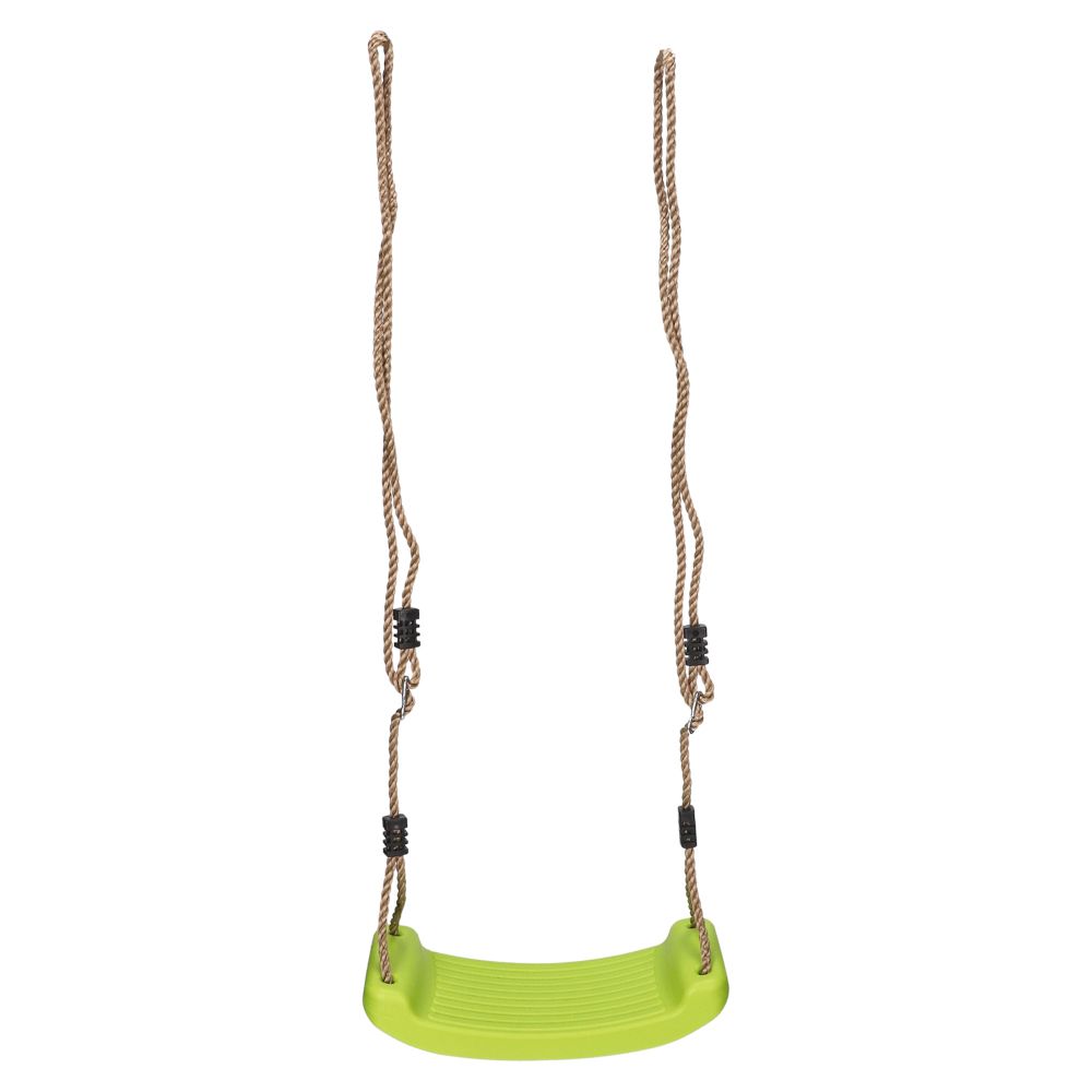 Columpio de plástico para el uso en exterior. Tiene cuerdas ajustables de 1,8 metros de largo máximo. Contiene sistema de anclaje con ganchos metálicos.
