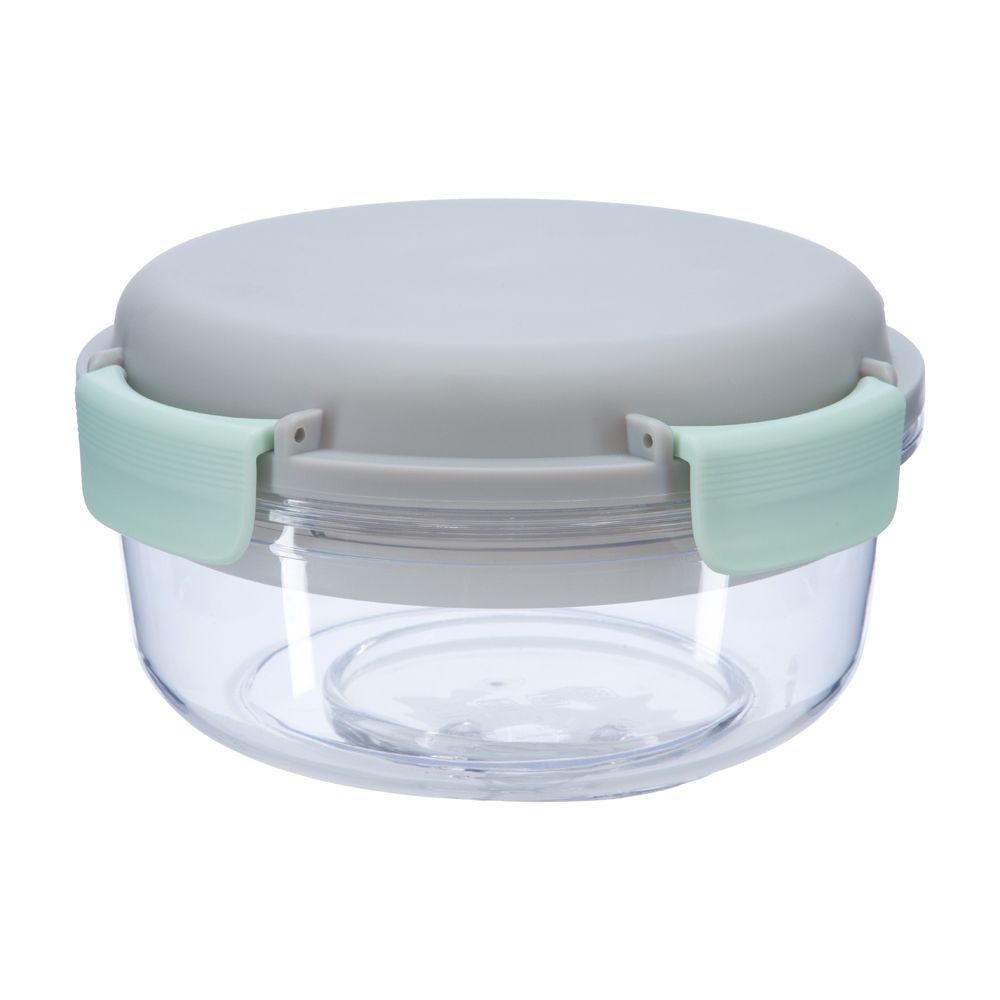 Contenedor de alimentos de tritan con separaciones superiores y salsero. Tiene una capacidad de 1 Litro.