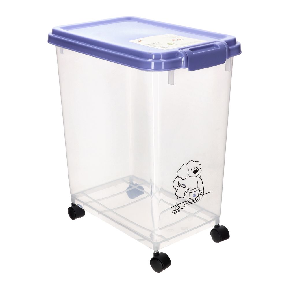 Contenedor de comida de mascotas de plástico. Te ayudará a conservar la comida de tu mascota fresca y seca por más tiempo. Incluye rueditas para moverlo y poruña.