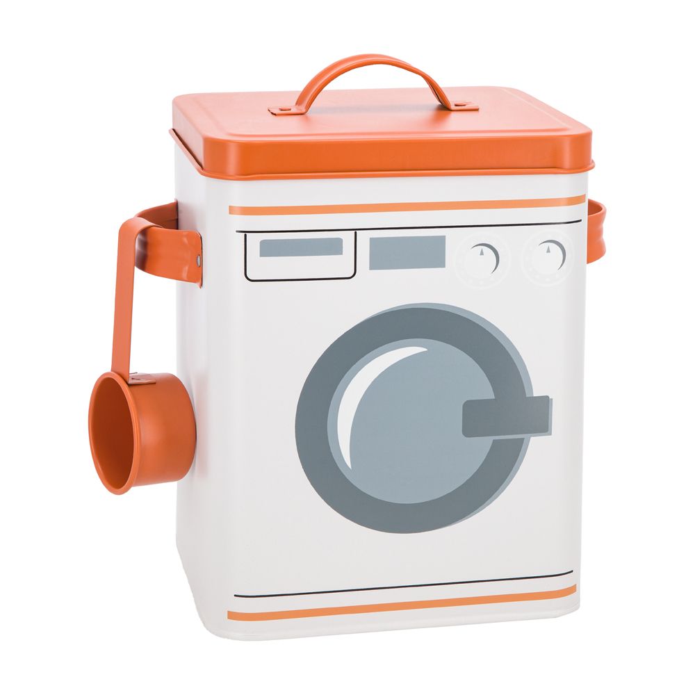 Contenedor de metal electropintado para guardar detergente en polvo con poruña de metal. Tiene una capacidad de 6.4 litros. Tiene un tamaño de 18x15.5x23 cm. Limpiar con paño húmedo.