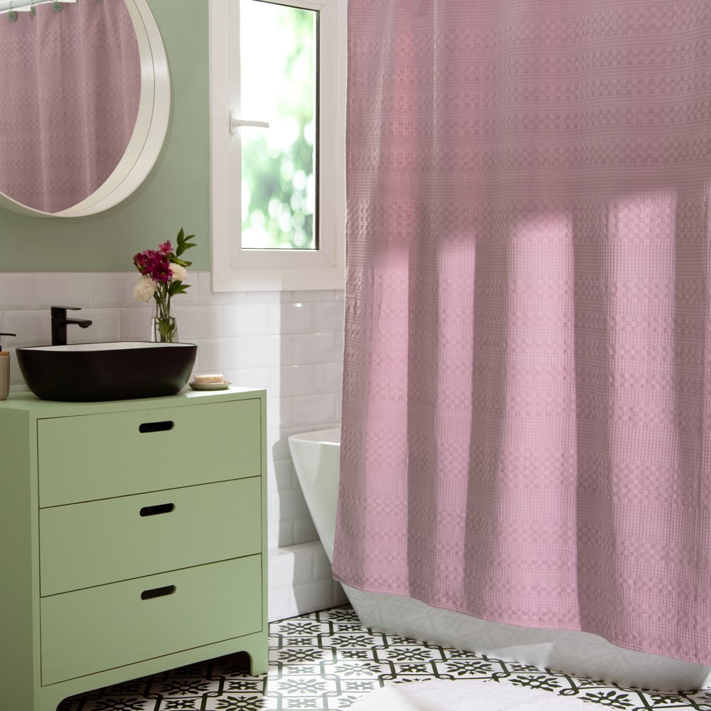 Cortina de baño de algodón con tejido waffle texturizado y diseño de hilado teñido. Tiene un tamaño de 180x190 cm. No incluye forro. Cuenta con certificación Oeko-Tex.