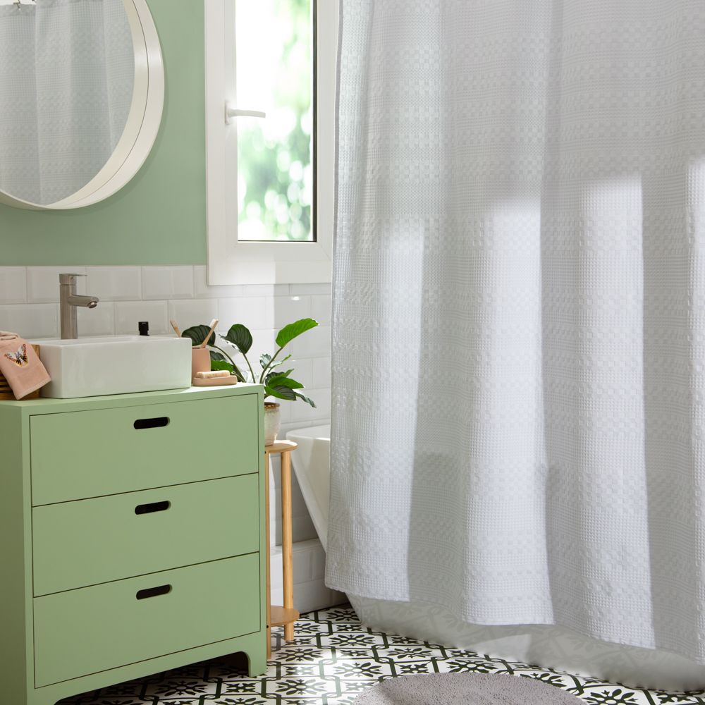 Cortina de baño de algodón con tejido waffle texturizado y diseño de hilado teñido. Tiene un tamaño de 180x190 cm. No incluye forro. Cuenta con certificación Oeko-Tex.