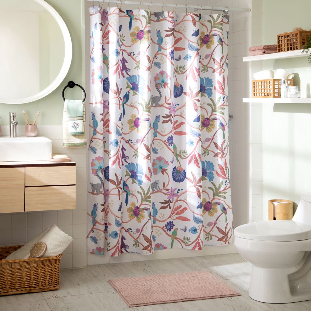 Cortina de baño de poliéster con tejido waffle y diseño estampado.