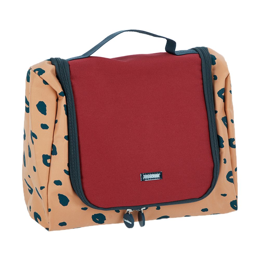 Cosmetiquera para viaje con amplio espacio para almacenar varios productos de cuidado personal y belleza. Incluye gancho para colgar y espejo interior. Tiene un tamaño de 27x12.5x21.5 cm. No lavar. No blanquear. No usar secadora. Planchar a temperatura media. No lavar en seco. Limpiar con paño húmedo.