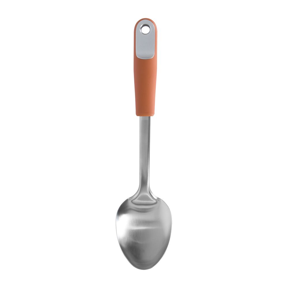 Cuchara de acero inoxidable y mango plástico recubierto con goma. Tiene un tamaño de 5x7.2x31 cm.