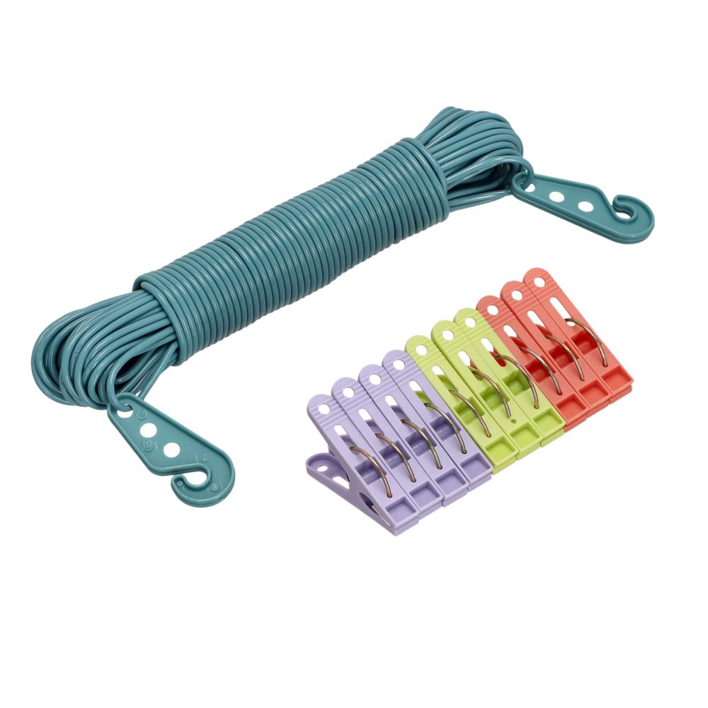 Cuerda para ropa con un diámetro de 2.7 mm. Cuenta con dos ganchos y 10 pinzas para la ropa.